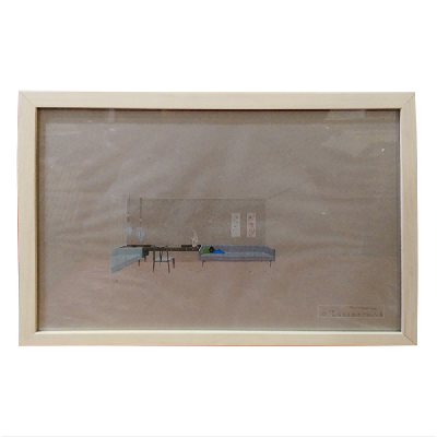 Boceto con sofás azules y escritorio. Lápices de color sobre papel estraza gris. Enmarcado.