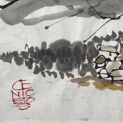 Más informacióna) Paisaje montañoso. Tinta negra y aguada sobre papel. Firmada 4-16-78 PEKIN. b) Paisaje con campos. Tinta y aguada sobre papel. Firmada.