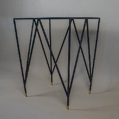 Mesa pedestal. Elaborada en acero negro. Cubierta rectangular sobre soportes lisos con casquillos de latón.