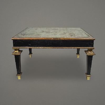 Mesa lateral, años 50. Estilo Neoclásico. Madera laqueada color negro y dorada. Soportes tipo estípite sobre casquillos de bronce.