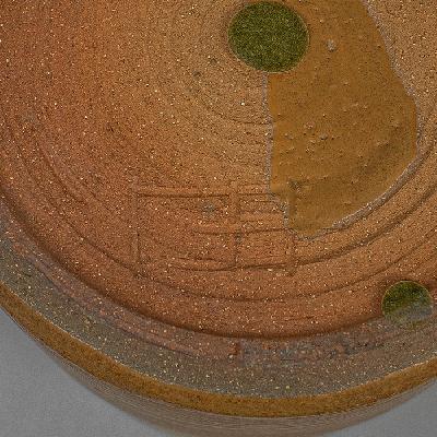 Especiero elaborado en cerámica de alta temperatura color naranja con vivos en beige. Diseño cilíndrico y tapa con asa de diseño orgánico. Con firma no identificada en base.