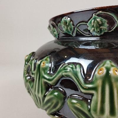 Vasija cachepot Ranas. Elaborada en loza de barro.