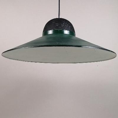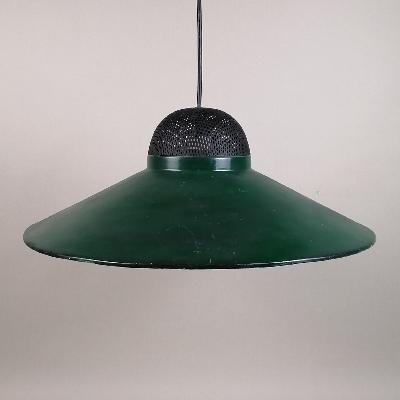 Par de lámparas de techo, años 70. Acero laqueado verde. Para 1 luz. Diseño a manera de plato con remate superior de malla.