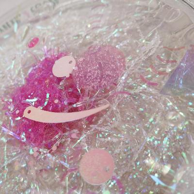 Pilar Pedroza. Teoría de Cuerdas. Caja de Petri, serpentina, confeti, lentejuela y resina.
