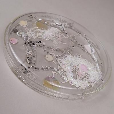 Pilar Pedroza. Desintegración. Cajas de Petri, lentejuela, confeti, alambre y resina.