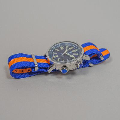 Reloj LIP Nautic-Ski Blue. Movimiento de cuarzo. Caja circular de 38 mm. Ø en acero con 2 coronas acanaladas; una con pulsador para ajuste de hora, otra para bisel giratorio interno. Carátula azul, índices de barras y rectángulos, manecillas de flecha y espada, cristal biselado. Pulso de nylon bicolor azul con naranja.