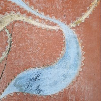 Charola. Valle de Bravo, México, 1992. Cerámica de alta temperatura color naranja con detalles en verde, azul y ocre. Diseño cuadrangular.