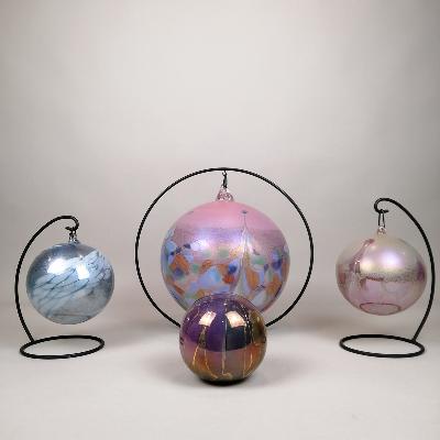 Juego de 4 esferas elaboradas en vidrio soplado. Diferentes colores y tamaños. 3 con bases para colgar en acero negro.