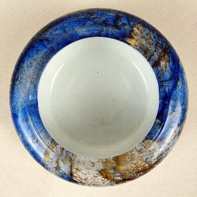 Cenicero. Italia, años 70. Cristal de Murano azul, blanco y ocre. Diseño redondo.