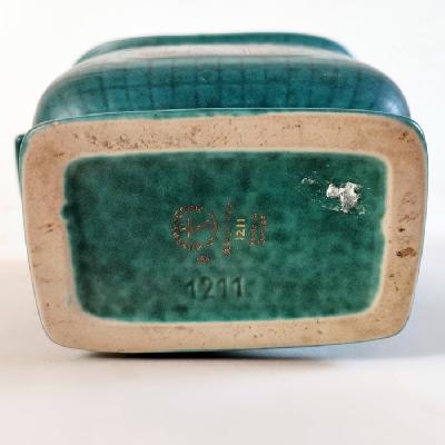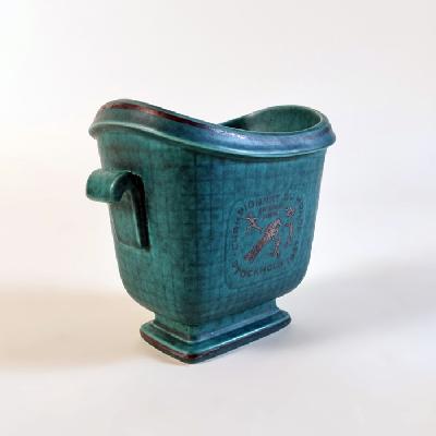 Florero de la Línea Argenta. Suecia, años 50. Edición especial para el Campeonato Mundial de Pentatlón Moderno Estocolmo 1957. Cerámica gres color verde. Diseño en forma de copa con 2 asas, relieve cuadriculado e incrustaciones de plata. En adverso, escudo alusivo al evento deportivo, al reverso representación del edificio del Ayuntamiento de Estocolmo. Sellado en base.