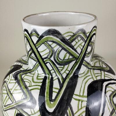 Jarrón. Cerámica de Cuernavaca. Decoración en forma de líneas en colores verde y negro. Firmado y fechado 2009.