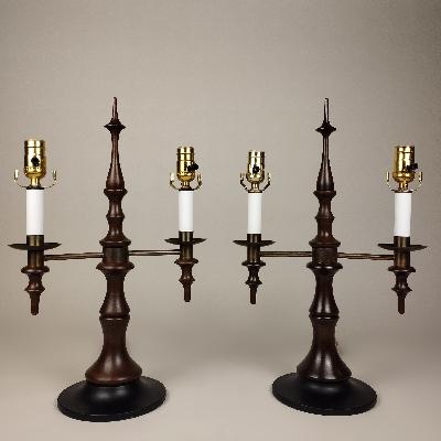 Juego de 3 lámparas, años 60. Madera tallada de caoba. Para 2 luces cada una. Diseño con fuste y brazos mixtilíneos.