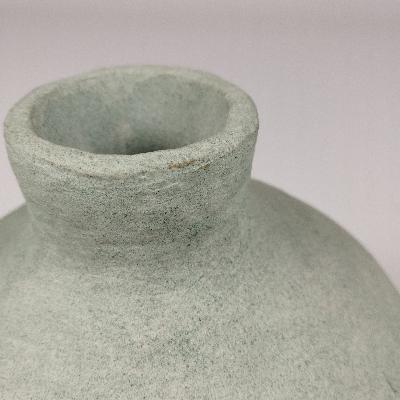 María Teresa Espriu. Vasija. Cerámica de alta temperatura verde aqua. Diseño abombado con boca angosta.