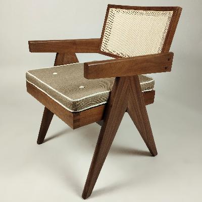 Par de sillas estilo Pierre Jeanneret. Madera de tzalam. Respaldos y asientos en palma tejida sobre soportes tipo tijera. Incluye cojín.