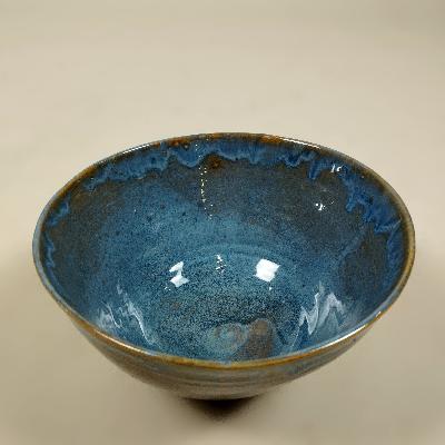 Tazón. Cerámica de alta temperatura color azul y ocre. Diseño redondo.