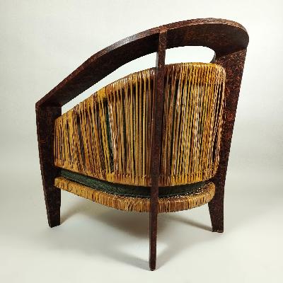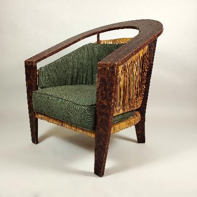 Par de sillones en madera texturizada con bejuco y tapicería verde