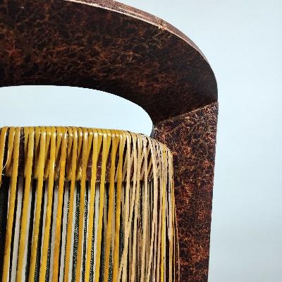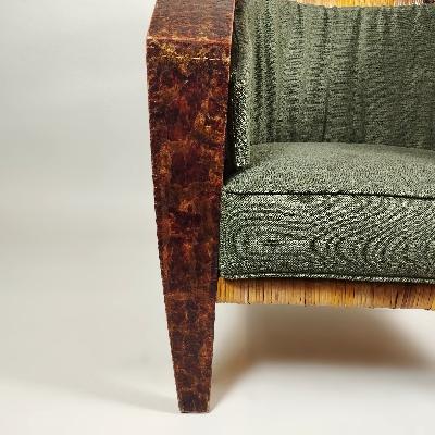 Par de sillones, años 70. Madera enchapada con acabado texturizado. Diseño de herradura con tapicería verde y aplicaciones de bejuco.