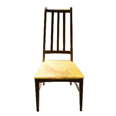 Juego de 6 sillas estilo Danés elaboradas en madera de roble. Respaldo alto con barandilla y asiento en tapicería amarilla sobre soportes cónicos.