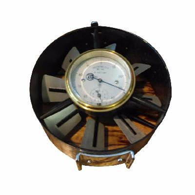 Anemómetro portátil. Japón, años 40. Estructura de metal negro y latón. Serie 34977. Con asa superior cromada, veleta interior trasera y carátula gris con bisel dorado.