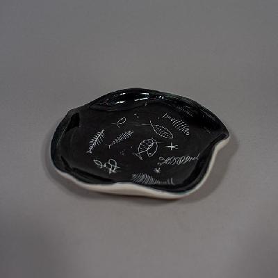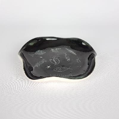 Botanero elaborado en cerámica, interior negro y exterior blanco. Diseño irregular ondulado con decoración a manera de peces.