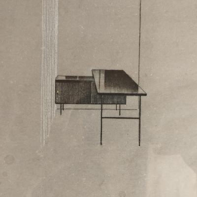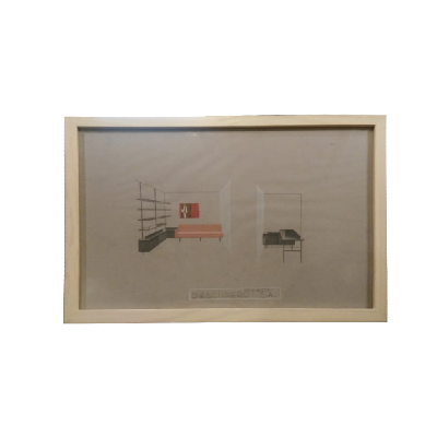 Boceto con estantería, sofá rosa y escritorio. Lápices de color sobre papel estraza gris. Enmarcado.