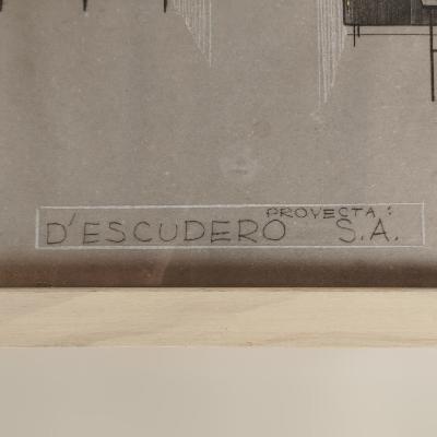 Eugenio Escudero. Boceto con estantería, sofá rosa y escritorio. Lápices de color sobre papel