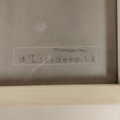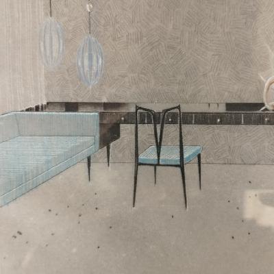 Más informaciónBoceto con sofás azules y escritorio. Lápices de color sobre papel estraza gris. Enmarcado.