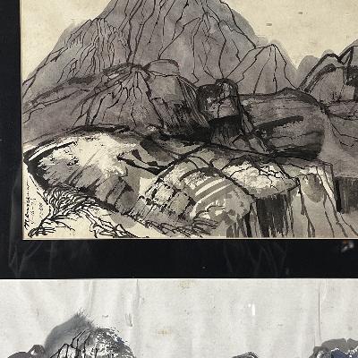a) Paisaje montañoso. Tinta negra y aguada sobre papel. Firmada 4-16-78 PEKIN. b) Paisaje con campos. Tinta y aguada sobre papel. Firmada.