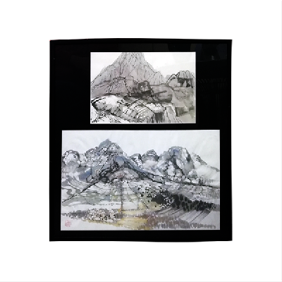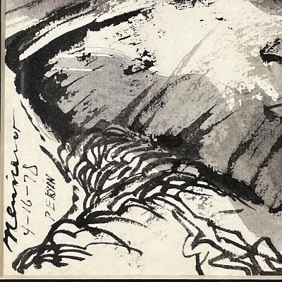 Más informacióna) Paisaje montañoso. Tinta negra y aguada sobre papel. Firmada 4-16-78 PEKIN. b) Paisaje con campos. Tinta y aguada sobre papel. Firmada.