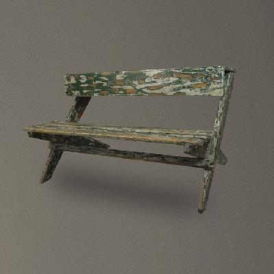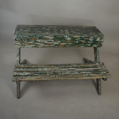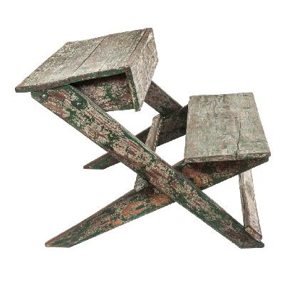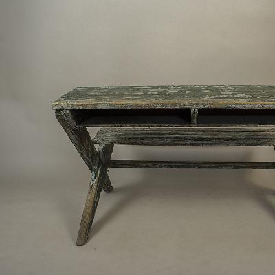 Banca con mesa. México, años 50. Diseño para el CAPFCE. Elaborada en madera laqueada color verde. Cubierta rectangular superior con 2 gavetas inferiores, banca lisa inferior y soportes a manera de tijera con travesaños.