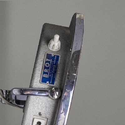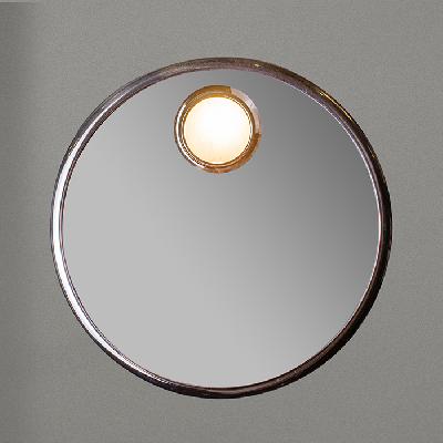 Espejo de baño. Francia, años 50. Estructura de acero y metal cromado. Con luna circular magnificante e iluminación interior antiempañante.