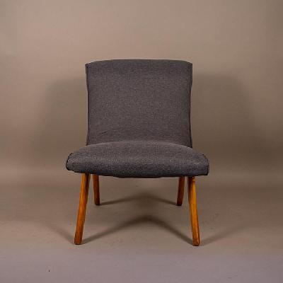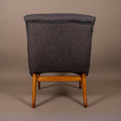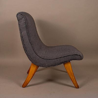 Silla San Miguelito. México, años 60. Estructura de madera de primavera. Tapicería gris sobre soportes semicurvos.