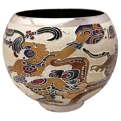 Depósito, años 80. Metal plateado y esmaltado con decoración a manera de figuras mayas.