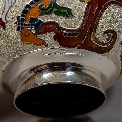 Más informaciónDepósito, años 80. Metal plateado y esmaltado con decoración a manera de figuras mayas.