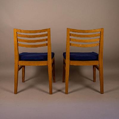 Par de sillas de comedor para exterior. EE.UU., siglo XX. De la colección Great Outdoors de Holly Hunt. Elaboradas en madera de teca. Respaldo en escalera y asiento en tapicería azul. Con placa en parte inferior.