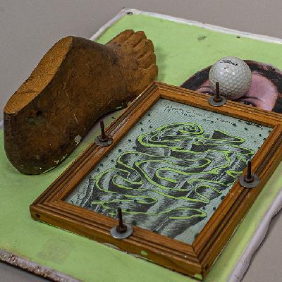Gineco News. Esmalte y madera tallada sobre anuncio electoral de lámina. Firmado y fechado al reverso 2003.