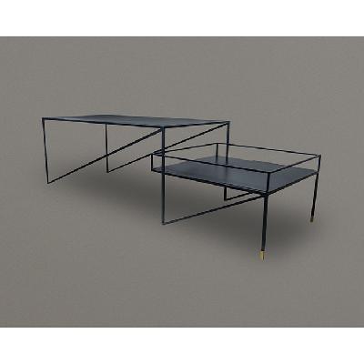 Mesa de centro elaborada en acero negro, laqueado con pintura electrostática. A 2 niveles. Cubierta superior calada, cubierta inferior lisa y soportes lisos con casquillos de latón.