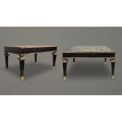 Más informaciónMesa lateral, años 50. Estilo Neoclásico. Madera laqueada color negro y dorada. Soportes tipo estípite sobre casquillos de bronce.
