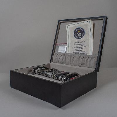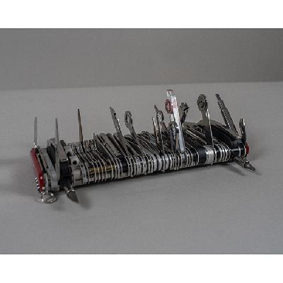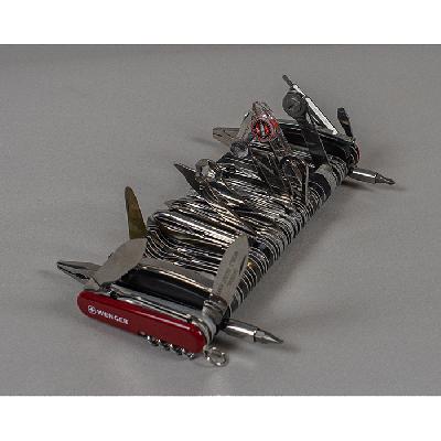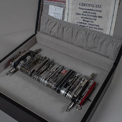 Navaja gigante 16999. Délemont, Suiza, 2007. Elaborado en acero. Con 87 herramientas y 141 funciones. Modelo ganador del récord Guinness. Con certificado, par de pilas AAAA, caja y estuche originales.