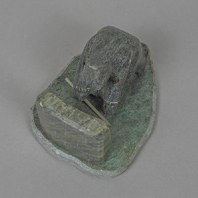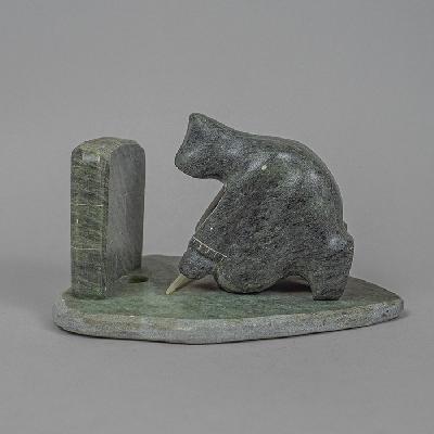 Más informaciónHombre con lanza. Canadá, años 70. Escultura de serpentina con lanza de resina. Sin firma.