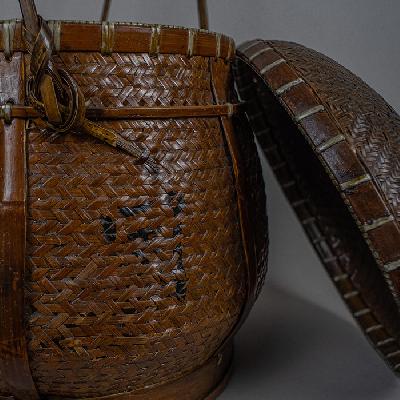 Canasta. China, años 50. Elaborada en madera de bambú y bejuco tejido. Diseño abombado con tapa, sinogramas y asas largas superiores.