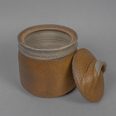 Especiero elaborado en cerámica de alta temperatura color naranja con vivos en beige. Diseño cilíndrico y tapa con asa de diseño orgánico. Con firma no identificada en base.