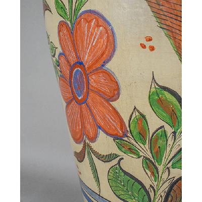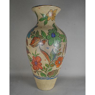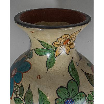 Jarrón. Tonalá, Jalisco, años 70. Elaborada en cerámica policromada. Diseño liso con decoración floral en colores verde, naranja y azul sobre fondo crema.