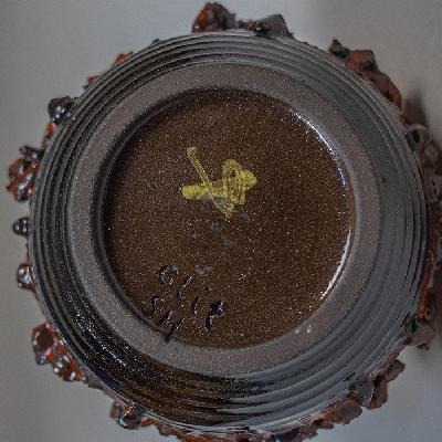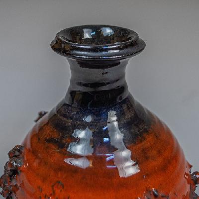 Violetero Glit. Islandia, años 60. Elaborado en cerámica de lava color naranja y café. Diseño anillado con textura.