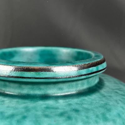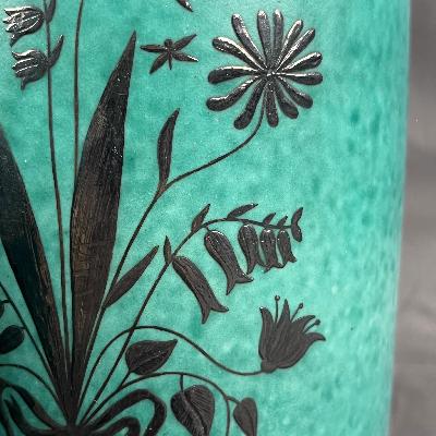 Florero. Suecia, años 50. Estilo Art Decó. Elaborado en cerámica gres color verde. Diseño liso. Con aplicaciones en plata de diseño floral. Sellado en base y numerado 1076 II.
