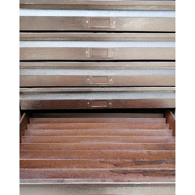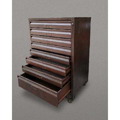 Planero, años 80. Elaborado en metal laqueado color café. Con 8 cajones.