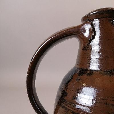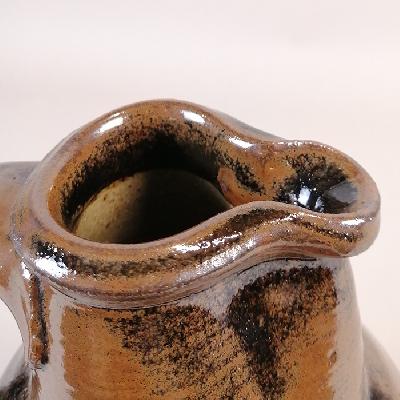 Jarra elaborada en cerámica de alta temperatura, acabado brillante café y negro. Con sello no identificado en base.