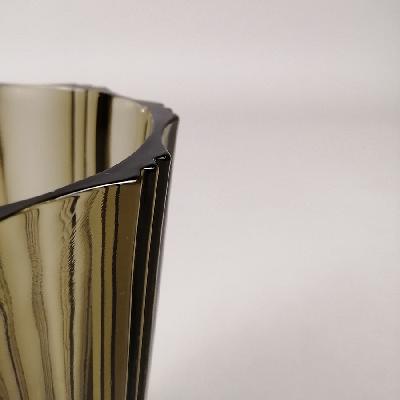 Florero. Francia, años 60. Elaborado en vidrio prensado ahumado. Diseño estriado.
