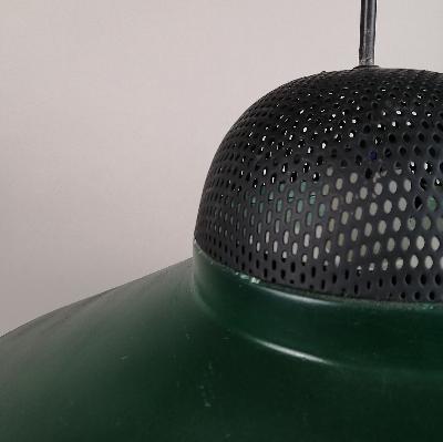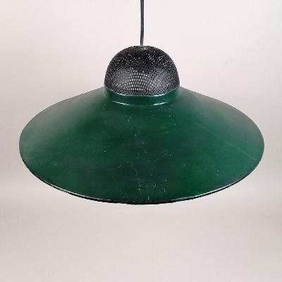 Par de lámparas de techo, años 70. Acero laqueado verde. Para 1 luz. Diseño a manera de plato con remate superior de malla.