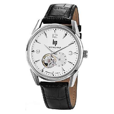 Reloj LIP Himalaya Automatic White. Movimiento automático. Caja tonneau de 46 x 40 mm. en acero con corona acanalada. Carátula blanca con ventanas de exhibición frontal y posterior, cuadrante segundero, índices arábigos y de triángulos, manecillas tipo espada, cristal. Pulso deployant de piel negra y acero.